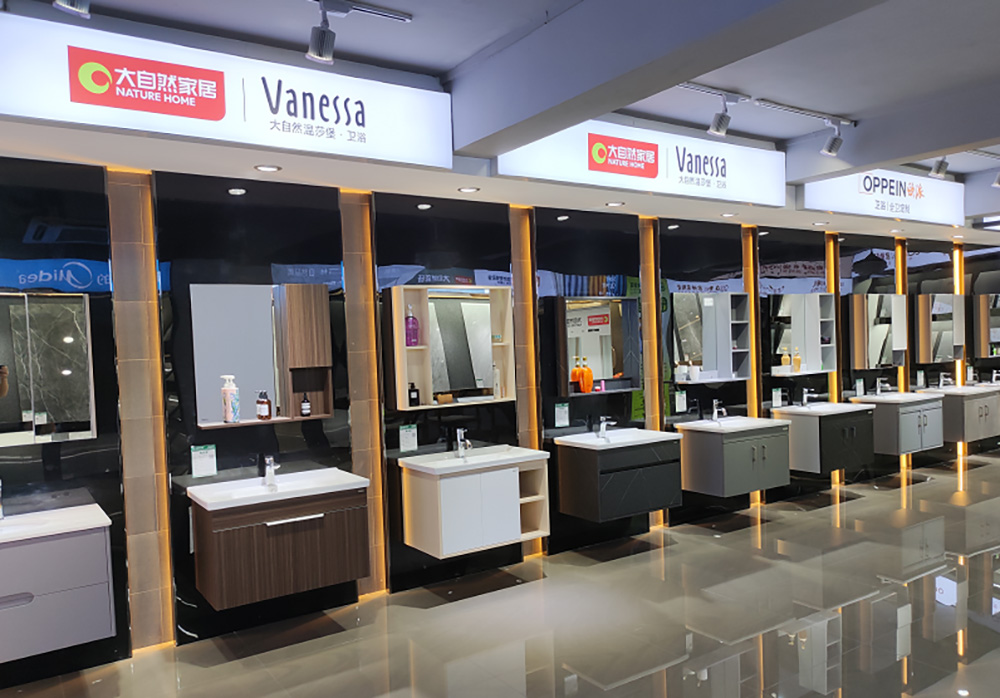 緣森泰裝飾位于中山市東區(qū)街道起灣道總部,已懸掛大自然家居和緣森泰裝飾“雙品牌”招牌。走進(jìn)展廳,木門、浴室柜、衛(wèi)浴、瓷磚等裝飾材料琳瑯盲目,品牌標(biāo)識(shí)統(tǒng)一為“大自然家居”。