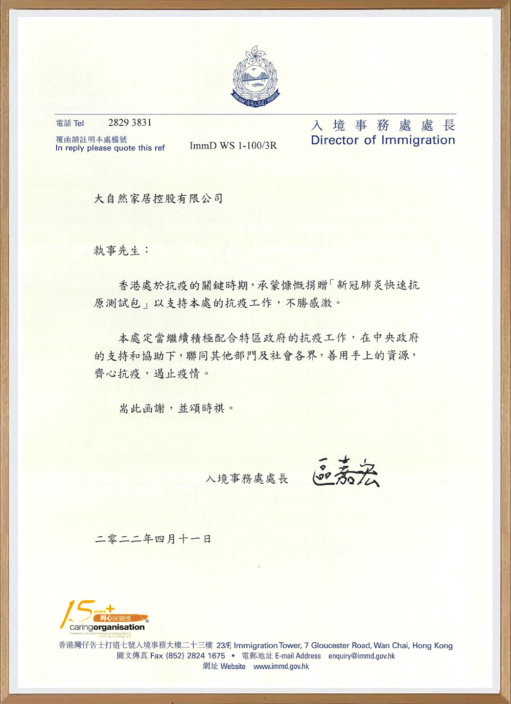 中國(guó)香港入境事務(wù)處授予大自然家居感謝信