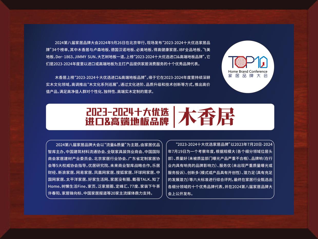 近日,2024年第八屆家居品牌大會于北京成功舉辦,并同步發(fā)布“2023-2024家居十大優(yōu)選品牌”榜單。其中,大自然家居榮獲“2023-2024十大優(yōu)選地板品牌”、大自然家居旗下高端品牌木香居榮獲“2023-2024十大優(yōu)選進(jìn)口&高端地板品牌”。