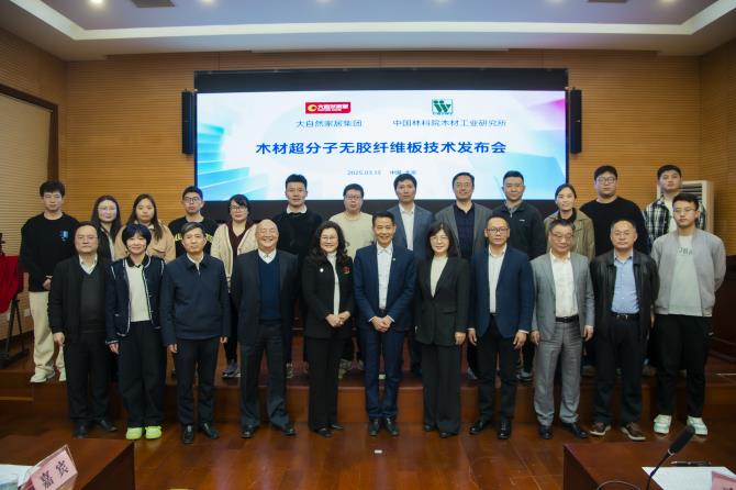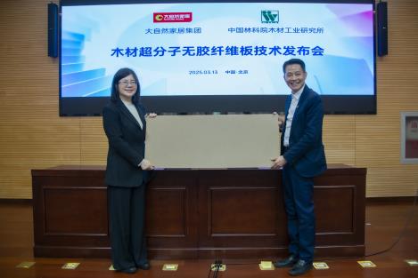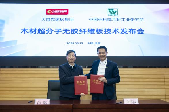 2025年3月13日,中國林業(yè)科學研究院木材工業(yè)研究所與大自然家居(中國)有限公司在北京共同發(fā)布“木材超分子無膠纖維板技術”