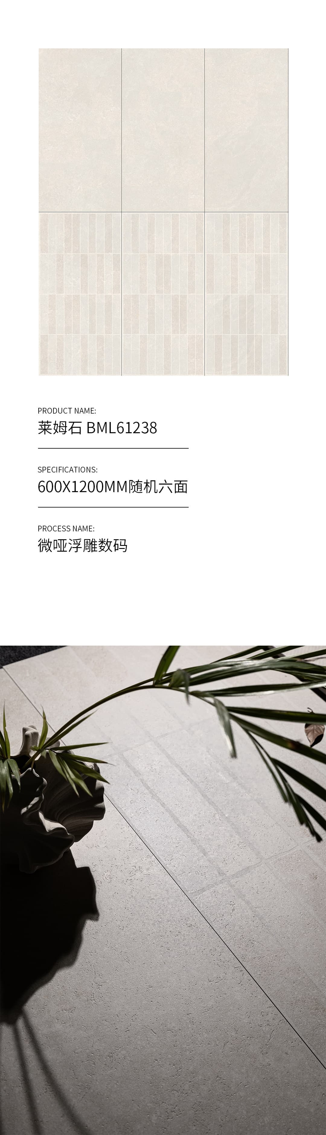 | 產(chǎn)品特性 | 表面柔和,防污效果強,防滑R10指標高,抗折強度好 |