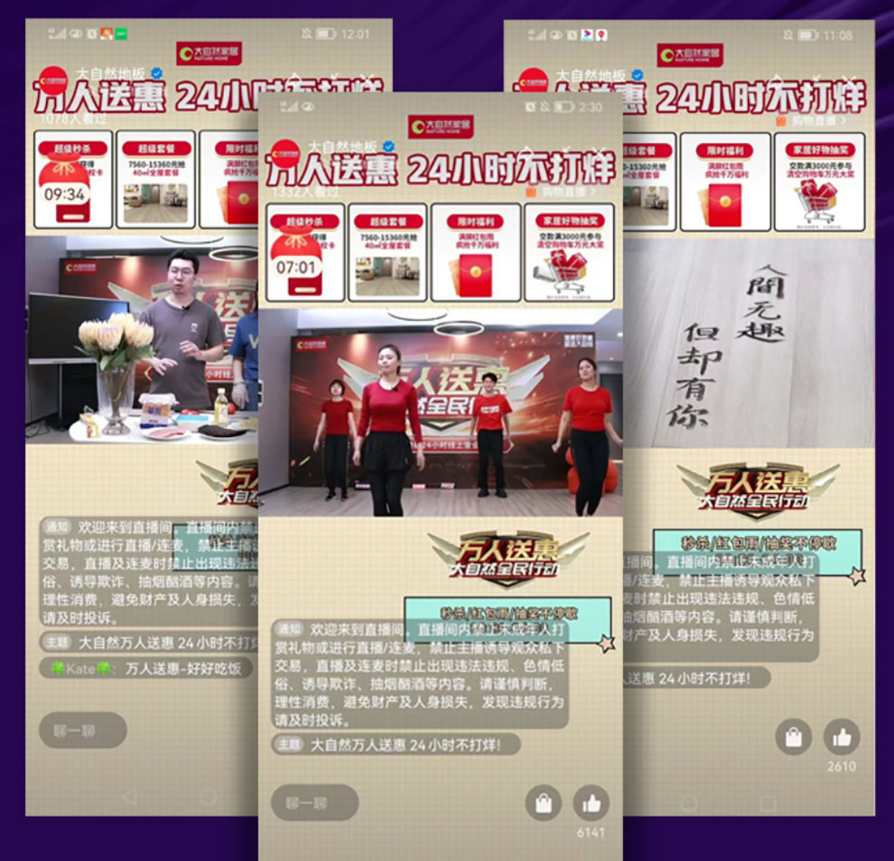 直播玩出綜藝范。大自然家居直播間打破了單純講解產(chǎn)品的枯燥方式,通過地板書法展、地板美食節(jié)、地板健身操等綜藝類活動,提高直播的趣味性,吸引粉絲參與互動,讓直播間變身為綜藝現(xiàn)場,受到粉絲的熱捧。憑借創(chuàng)新的直播玩法,大自然家居在618大促期間多次占據(jù)天貓平臺直播小時榜榜首。