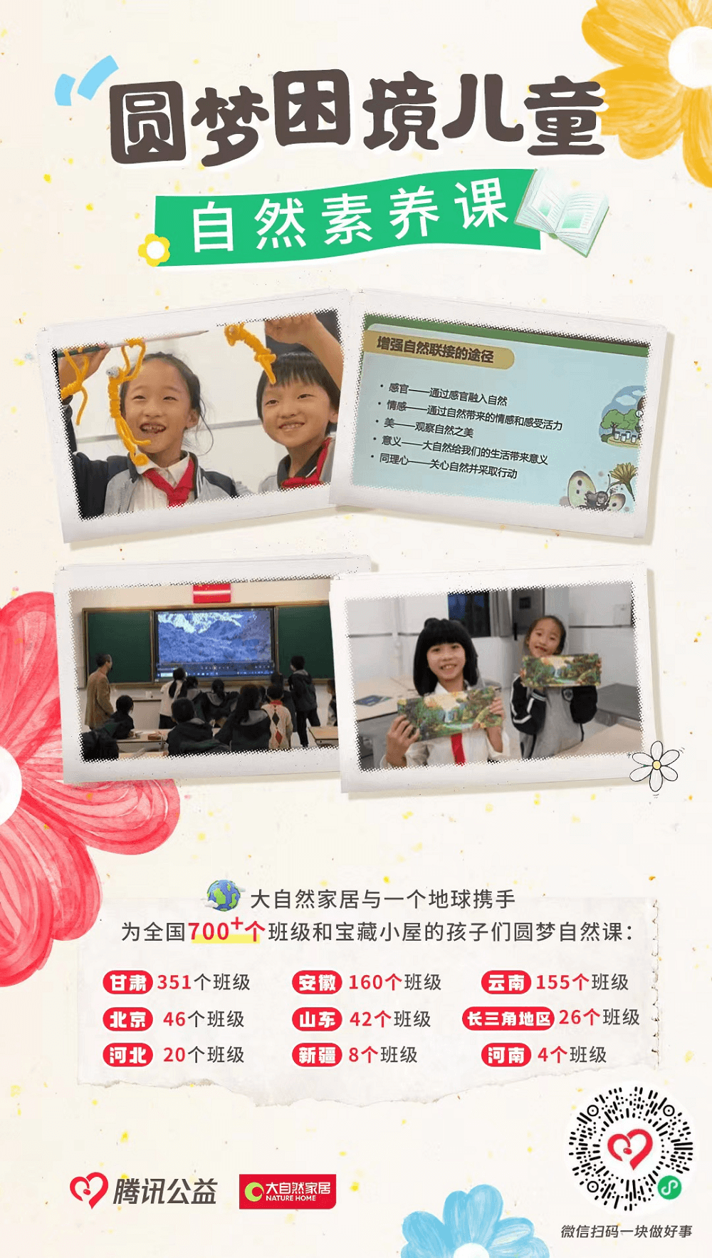 今年99公益日,騰訊公益攜手深圳市“一個地球”自然基金會、上海聯(lián)勸公益基金會,將關(guān)懷投向城市里的困境兒童,為鄉(xiāng)村學校提供豐富的生物多樣性保護課程,提升當?shù)厍嗌倌甑沫h(huán)保意識,在促進教育公平和普惠的同時,培養(yǎng)熱愛自然、尊重自然的鄉(xiāng)村生態(tài)文明新一代。公益行動期間,只要捐贈32元即可支持一名困境兒童一堂自然課,本次公益行動預計覆蓋甘肅351個班級、安徽160個班級、云南155個班級、北京46個班級、山東42個班級、長三角地區(qū)26個班級、河北20個班級、新疆8個班級、河南4個班級,為全國超700個班級和寶藏小屋的孩子們圓夢自然課助力。